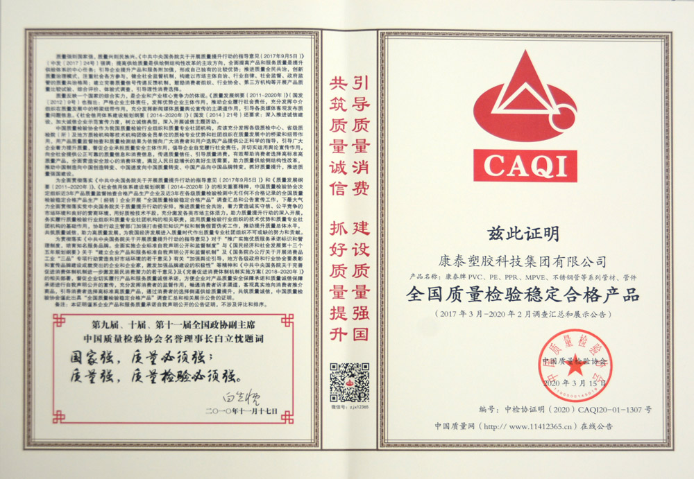 康泰,作為一家專注生態(tài)管道工程系統(tǒng)整體解決方案的集團企業(yè),始終注重產(chǎn)品的質(zhì)量的提升和把控,始終注重向智能化、系統(tǒng)化、生態(tài)化以及用戶體驗感創(chuàng)新升級。在其成長的20年間,康泰先后獲得“中國輕工業(yè)百強企業(yè)”、“中國塑膠建材行業(yè)十大品牌”、“中國房地產(chǎn)開發(fā)企業(yè)500強首選供應(yīng)商”、“政府采購塑料管道十大品牌”、“四川省優(yōu)秀品牌企業(yè)”、“成都市百強民營企業(yè)”等榮譽。不僅康泰的品牌知名度已經(jīng)家喻戶曉,而且康泰的產(chǎn)品質(zhì)量也是經(jīng)得起檢驗的。比如,3月15日當天,中國質(zhì)量檢驗協(xié)會授予康泰的“全國塑膠管道行業(yè)質(zhì)量領(lǐng)軍企業(yè)”、“全國質(zhì)量檢驗穩(wěn)定合格產(chǎn)品”、“全國產(chǎn)品和服務(wù)質(zhì)量程誠信示范企業(yè)”稱號就是最好的證明。