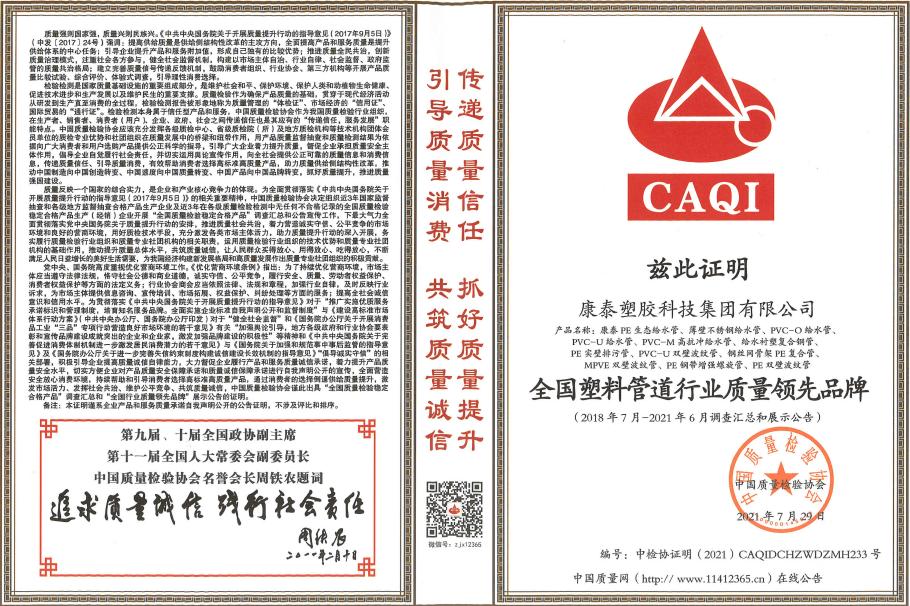 近日,康泰榮獲由中國(guó)質(zhì)量檢驗(yàn)協(xié)會(huì)頒發(fā)的“全國(guó)塑料管道行業(yè)質(zhì)量領(lǐng)先品牌”、“全國(guó)塑料管道行業(yè)質(zhì)量領(lǐng)先企業(yè)”、“全國(guó)質(zhì)量檢驗(yàn)穩(wěn)定合格產(chǎn)品”稱(chēng)號(hào)。