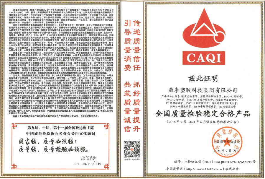 塑料管道行業(yè)是一個(gè)特殊的行業(yè),質(zhì)量是這個(gè)行業(yè)的生命線(xiàn)。它的好壞關(guān)系到萬(wàn)千家庭的健康與安全。自成立以來(lái),康泰始終以工匠精神締造產(chǎn)品,將產(chǎn)品的品質(zhì)放在首位,造放心產(chǎn)品,做良心工程。憑著對(duì)初心的執(zhí)著堅(jiān)守,康泰以“生態(tài)和環(huán)?!睘樯a(chǎn)理念,對(duì)產(chǎn)品質(zhì)量的把控始終處于行業(yè)前列,率先通過(guò)了ISO9001國(guó)際質(zhì)量體系認(rèn)證,更成為參與國(guó)家塑料管道行業(yè)標(biāo)準(zhǔn)、國(guó)家標(biāo)準(zhǔn)編寫(xiě)和制定的新國(guó)貨品牌。