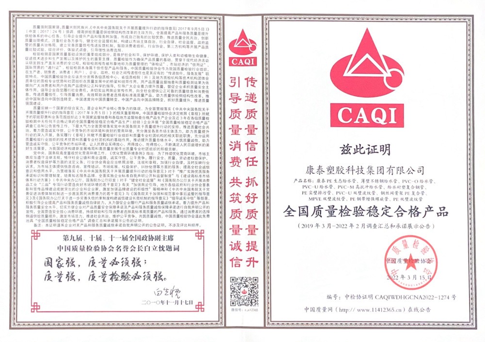 獲得這些榮譽(yù)獎(jiǎng)項(xiàng)是中國(guó)質(zhì)量檢驗(yàn)協(xié)會(huì)與消費(fèi)者對(duì)康泰塑膠產(chǎn)品品質(zhì)、服務(wù)質(zhì)量、品牌口碑的一致肯定,也是對(duì)康泰產(chǎn)品和實(shí)力的贊許與認(rèn)可。這也激勵(lì)著康泰繼續(xù)秉持“為智慧城市建設(shè)提供生態(tài)管道系統(tǒng)”的企業(yè)使命,在追求專(zhuān)業(yè)與一流品質(zhì)的路上不斷攀登高峰,為消費(fèi)者提供更加優(yōu)質(zhì)的產(chǎn)品和服務(wù),為中國(guó)塑膠行業(yè)樹(shù)立一個(gè)嶄新的標(biāo)桿。