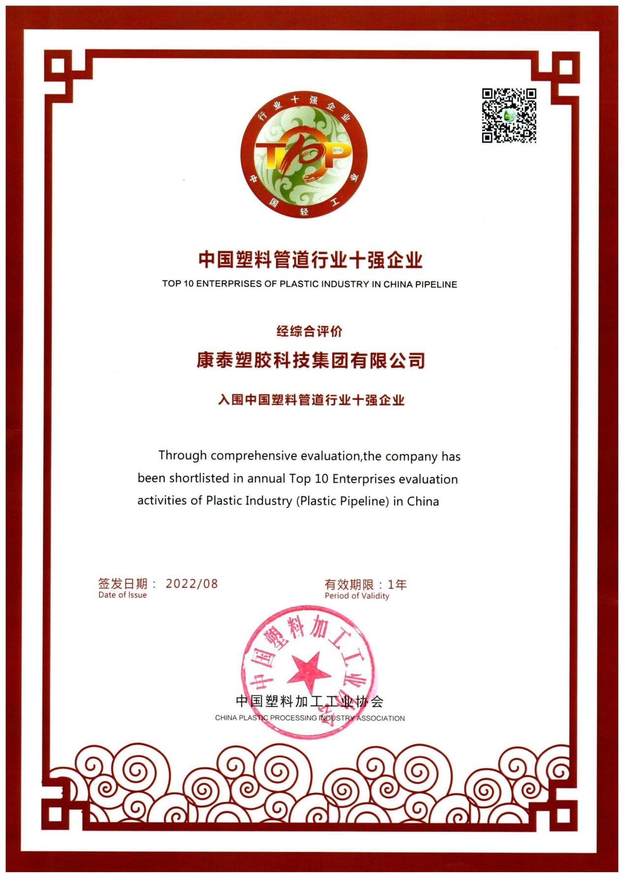 康泰集團(tuán)連續(xù)年榮膺中國(guó)輕工業(yè)塑料管材行業(yè)十強(qiáng)