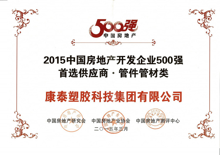?????? 日前,“2015中國(guó)房地產(chǎn)500強(qiáng)測(cè)評(píng)成果發(fā)布會(huì)暨500強(qiáng)峰會(huì)”在北京國(guó)貿(mào)隆重舉行。值得恭賀的是,康泰集團(tuán)首次入圍“地產(chǎn)500強(qiáng)首選供應(yīng)商 管件管材類”榜單,獲得了由中國(guó)房地產(chǎn)研究會(huì)、中國(guó)房地產(chǎn)業(yè)協(xié)會(huì)和中國(guó)房地產(chǎn)測(cè)評(píng)中心聯(lián)合頒發(fā)的“2015中國(guó)房地產(chǎn)開(kāi)發(fā)企業(yè)500強(qiáng)首選供應(yīng)商品牌”榮譽(yù)證書(shū)。