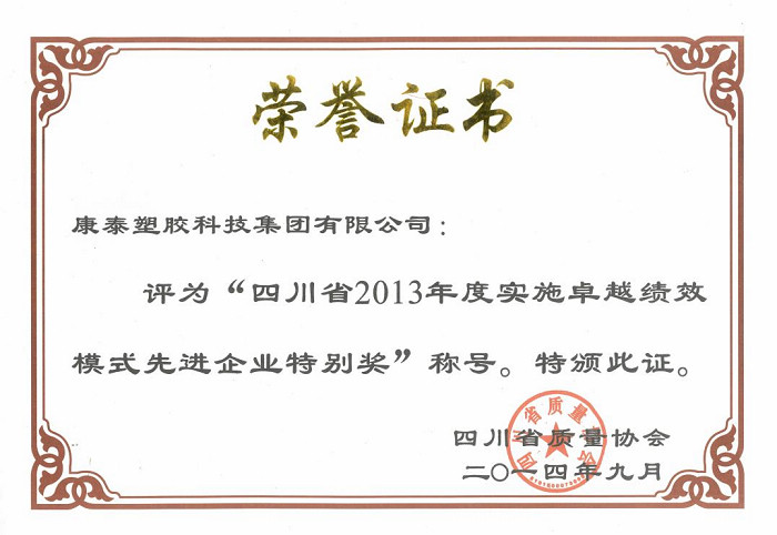 圖二:四川省2013年度實(shí)施卓越績效模式先進(jìn)企業(yè)特別獎(jiǎng)
