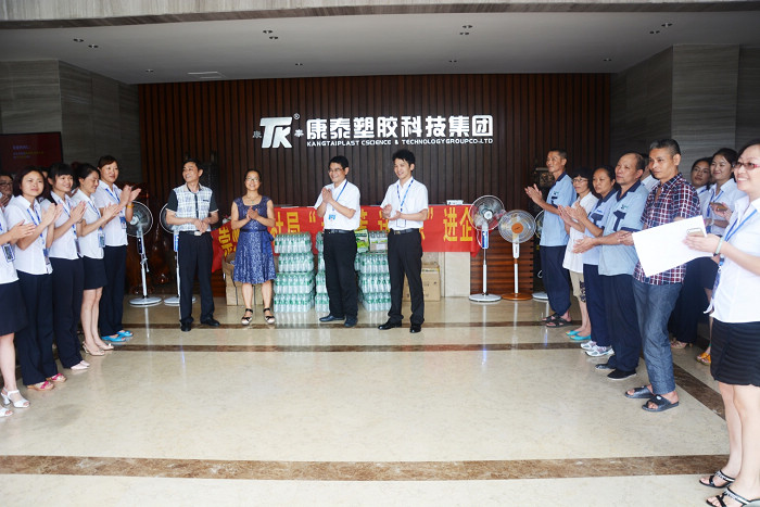 ?????? 8月7日下午,崇州市人力資源和社會(huì)保障局副局長(zhǎng)、工會(huì)主席李茂清帶領(lǐng)局“送清涼”慰問(wèn)組,來(lái)到康泰塑膠科技集團(tuán)有限公司,工會(huì)主席吳彬及人事行政中心呂旭梅經(jīng)理接待了慰問(wèn)組。人社部門(mén)為公司職工送上了電風(fēng)扇、礦泉水、和防暑物品,并將有關(guān)勞動(dòng)安全、工資待遇等內(nèi)容的人社政策宣傳資料送到職工手中,使職工進(jìn)一步了解有關(guān)政策法規(guī),依法主動(dòng)保護(hù)自身合法權(quán)益。