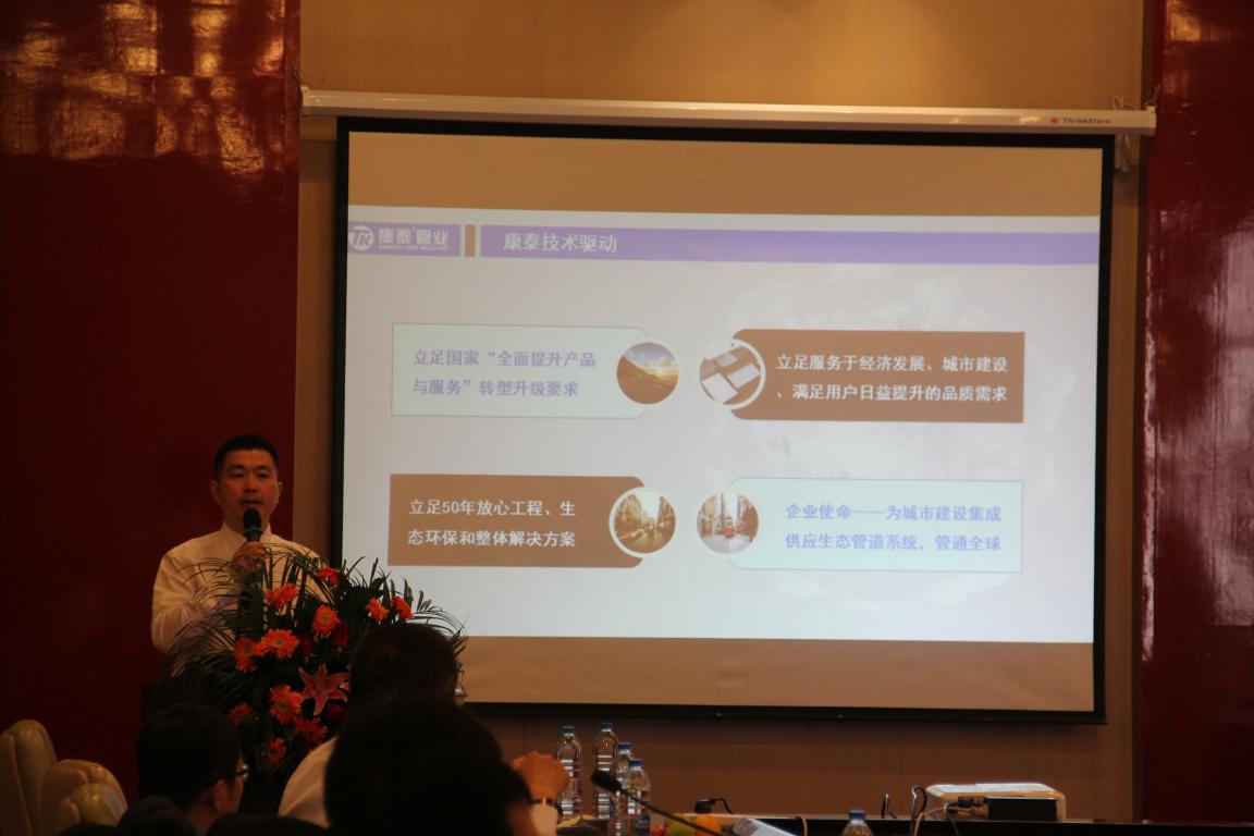接著,康泰集團技術總監(jiān)張雙全向在場嘉賓介紹了康泰集團的新產(chǎn)品體系,重點介紹了康泰MPP單壁波紋管道系統(tǒng)、環(huán)保雨、污水用MPVE?雙壁波紋管道系統(tǒng)等產(chǎn)品。參會嘉賓認真聽取了公司的產(chǎn)品介紹,對康泰新產(chǎn)品的物理性能、產(chǎn)品質(zhì)量和化學配方等方面給予了高度評價。